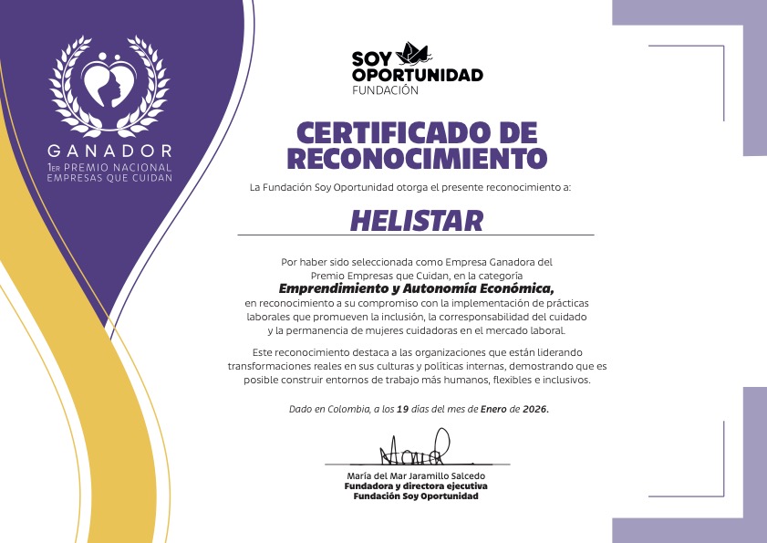 Helistar fue reconocida como ganadora en la categoría Emprendimiento en la primera edición del Premio Empresas que Cuidan, otorgado por la Fundación Soy Oportunidad, gracias al Proyecto “Navega y Transforma”, una iniciativa implementada en 2025 y orientada al empoderamiento económico de mujeres cuidadoras en la región de Cúcuta.